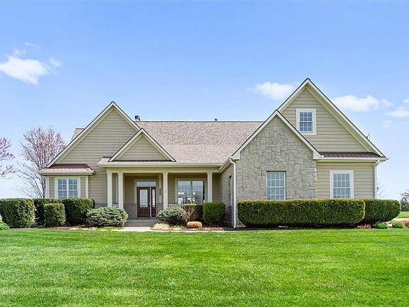 This beautifully designed custom-built ranch home combines standout curb appeal with timeless stone accents on a scenic 5-acre lot. Featuring 3 bedrooms, 2.5 baths, and a split-bedroom layout, this home offers the perfect blend of comfort and privacy. The open-concept living area boasts a striking woodburning fireplace with hand-cut stone surround and built-ins, soaring vaulted ceilings, rich hardwood floors, and abundant natural light. French doors lead to a covered patio, extending to an expansive paver patio with a pergola and fire pit perfect for outdoor entertaining. The chef’s kitchen impresses with granite countertops, stainless steel appliances, and two spacious dining areas. A main-floor laundry room includes built-in storage and clothing racks for convenience. The luxurious primary suite features patio access, dual closets, a granite dual vanity with hidden outlets, a whirlpool tub, and a walk-in shower. Upstairs, a versatile bonus room with a dedicated HVAC zone offers additional living space. The finished walk-up basement is a showstopper, complete with a second hand-cut stone fireplace, wet bar with dual-tap beverage dispenser, home theater with hidden rear cabling, pool table, storm shelter, and ample storage. Additional highlights include 6 inch exterior walls, a 30’x40’ outbuilding with 100-amp electric and a 55-gallon air compressor, whole-house audio with six zones, pre-wired Ethernet/phone/video, radon mitigation, and a whole-house water filtration system. A rare opportunity to own a meticulously crafted estate that seamlessly blends beauty, functionality, and premium features!