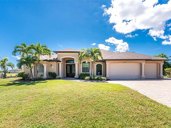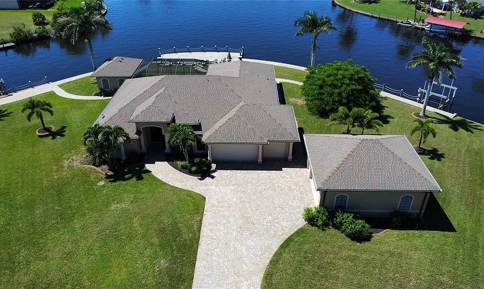 This oversized tip lot property offers 311 feet of seawall and southwestern exposure with expansive water views. This executive home features both indoor and outdoor living spaces. The gourmet kitchen includes granite countertops, a 12-foot breakfast bar, and a walk-in pantry. Dining options include a formal dining room, a dinette, and a lanai. Porcelain tile floors and glass sliders connect most rooms to the lanai. The master suite has two vanities, a tiled Roman shower, a garden tub, and designer lighting. Two generously sized guest bedrooms share a full bathroom. The expansive, screened lanai features two bar/summer kitchens, one within an adjoining cabana. A heated saltwater pool is centrally located with a dedicated pool bath and outdoor shower. Paver driveways and walkways surround the house. A large 1500 sq ft paver patio over the waterway is ideal for enjoying sunsets and entertaining. Two captain walkways lead to two boat lifts (10K lb and 12K lb), both with docks. The attached three-car garage has epoxy flooring. The detached garage also has an epoxy floor, New Age Powder-Coated Pro Series cabinets, a built-in workbench, and upper storage. Additional features include manabloc plumbing, foam insulation (house and both garages), impact glass, accordion shutters, 8’ reinforced insulated garage doors, an irrigation system with two back-up wells, LED outdoor lighting.