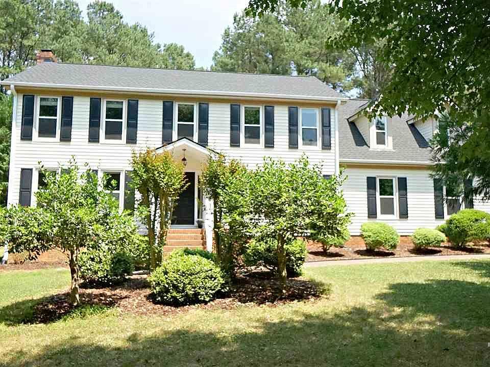 Beautifully updated home on private 1+acre homesite in convenient North Raleigh! New roof, gutters, windows, carpet, paint, light fixtures, toilets, electrical box & downstairs HVAC.Hardwoods refinished.Spacious family room w/masonry fireplace is open to sunny kitchen w/breakfast room, island, ss appliances & pantry.Spacious master suite w/2 walk-in closets & private bath. Bedroom w/updated jack-in-jill bath.Bonus w/lots of storage.Deck overlooking flat backyard.2 car garage.Riding lawn mower conveys.