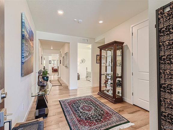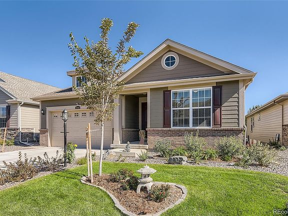 Beautiful 1 Year New Home in Heritage Todd Creek - Active Adult Golf Course Community. This 3 Bedroom, 1 Office, 3 Bath Ascott Model home is full of upgrades from Granite/Quartz Countertops throughout and Engineered High-end Hardwood Floors, California Closets in bedrooms / Mudroom, whole home Humidifier and Extended Covered Backyard Trex Deck. Spacious Open Floor-plan includes a great room of kitchen/dining room/family room/gas fireplace that leads out to the extended 25’x11.5” back deck. Designer kitchen comes wood cabinets, Granite Island and Countertop, Gas Stove with GE Appliances. The nearby spacious office is entered through French doors and overlooks the extended patio. Large Master Bedroom/Bathroom Retreat with dual vanities Granite Countertop, Oversized Shower with floor to ceiling tile work, and upgraded Walk-In California Closet. Two additional main floor Bedrooms with full bath are perfect for out-of-town guests or an additional office. Property includes a Tandem 3 Car Garage to store vehicles, golf cart, bikes and other toys. Mudroom comes with upgraded storage cabinets and sink. Downstairs is an unfinished garden level basement that is plumbed for bathroom. Yard is professionally landscaped for low maintenance with irrigation system installed. Only blocks away from the Clubhouse that offers the perfect place to make friends in the 2 Pools and hot tub, workout facility, game and club rooms, library, billiards, restaurant, fitness classes, golf course, tennis, and pickle ball courts. Yes, it’s resort living in a friendly neighborhood community.