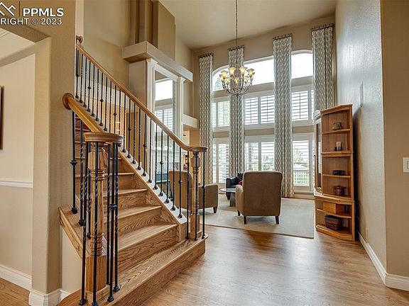 Gorgeous home in a great location, on almost 1/2 an acre with awesome Mountain and Peak views! Completely updated popular Classic Homes Dynasty floorplan. Dramatic entry with hardwood floors. Main-level master bedroom with double-sided gas fireplace and a remodeled 5-piece master bath. The kitchen was remodeled in 2021 with quartz countertops, maple cabinets, soft-close drawers, double ovens, an induction cooktop, a microwave drawer and has hardwood floors. Vaulted great room with marble surrounding another double-sided gas fireplace, hardwood floors and a beautiful chandelier. Separate dining room with hardwood floors, plus a kitchen eating space. Or use the dining room as an office off the main hall. Remodeled laundry room with sink, tile back splash and new custom cabinetry. Rounding out the main level is an extended huge family room with hardwood floors. Upstairs Features a loft/office with hardwood floors, two bedrooms and a remodeled full bath. The full basement features a huge rec room, two bedrooms, ¾ bath and a large storage room. Extensive new hardwood flooring. All new interior doors and trim. Neutral paint colors throughout, plantation shutters, custom drapery. Many high end Andersen windows. New carpet 2020. The large deck, refinished in 2023, offers massive Peak views. The yard is professionally landscaped with landscape lighting and three-season plants. NEW CLASS 4 ROOF 2022. Exterior painted in 2022. Quick access to I-25 (2 miles), grocery, and other shopping. A few more miles to lots of entertainment and more restaurants. Whole house energy audit done and this home is on par with new homes energy efficiency. Easy commute to Castle Rock/Denver. Award-winning Academy School District 20. Only two owners. Pride of ownership!