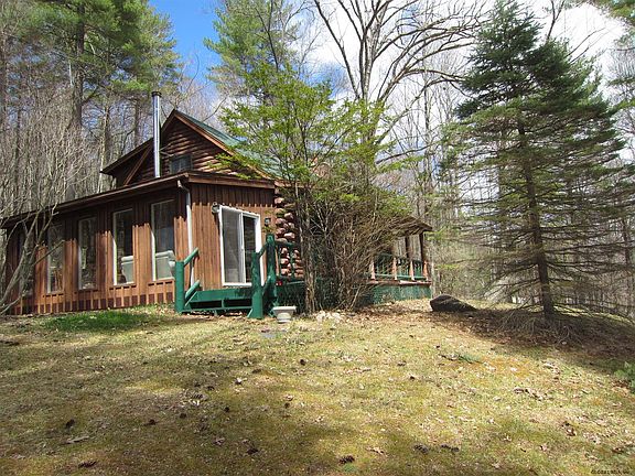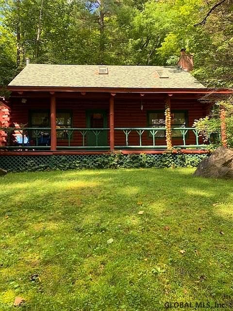 LOG CABIN IN THE WOODS!! Charming 2 bedroom log cabin nestles on a knoll with mountain views. Living room with brick fireplace, wood beams, and vaulted ceiling. Eat in kitchen with dining area and toasty wood stove. Main floor full bath. Southern facing sunroom with windowed walls and sliders out. Upstairs is 2 bedrooms and half bath, and a small loft overlooking the open living room. Full basement with laundry and work bench, plus Bilco doors for easy access. Full length front porch to enjoy the view. Lake George Schools. Close to Lake George for quick launching of your boat.