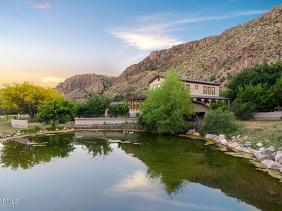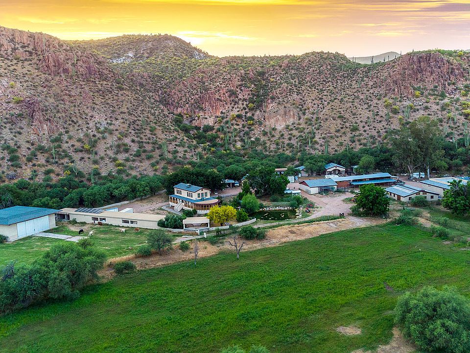 100% surrounded by Tonto National Forest, this 30.92 acre ranch sits down in a private canyon with Cherry Creek running through year round! This property has a total of 17 structures totaling over 34,000 sqft, six of which are livable including a 6 bed/6 bathroom bunk house with a large kitchen dinning & bar/game room upstairs, a 3 bed / 3 bath house, two different 2 bed / 1 bath houses, a 3 bed / 1 bath house and a 1 bed / 1 bath house. Other buildings include a 6,750 sqft fully enclosed hanger, 3,250 sqft equipment shed, 2,250 sqft green house, 3,200 sqft 13 bay garage, hay barn, 2 gazebos, and other sheds. This ranch is totally off the grid running off solar panels and large generators. About 15 miles east of Roosevelt Lake and just 1/4 mile North of the Salt River Wilderness Area!! So much beauty to mention about this property with Cherry Creek and its green riparian growth on the banks while bisecting the property providing irrigation water to the open fields and pastures to grow for livestock and beauty. The high mountains & cliffs surrounding the property are stunning with all the saguaros perched all around. There is a good size pond, fruit trees, fig trees, and lots of other huge trees around the property for shade. This property could be a great part time or full time getaway from the hustle and bustle of city life, maybe a bed and breakfast, corporate retreat property for a dude ranch, short term rental property for outdoor enthusiasts with all the trails and outdoor adventures of the surrounding area, or just ranch life of living off the grid like the good old days!