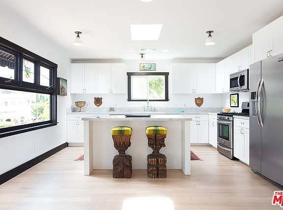 Showstopping views of palm trees + blue skies stretch to the Observatory from this hilltop Silver Lake bettershelter stunner. Pass the fresh landscaping and enter into your 3BR/2.5BA wide open floor plan. A restored beauty. LR + DR offer panoramic views, character features including stained glass details, restored vintage chandeliers, and sliding door access to an entertaining deck. Sun-drenched kitchen features custom cabinetry, marble counters, SS Frigidaire Gallery appl + island! Master suite features vaulted ceilings w/exposed beams, 2 huge double-hung walk-in closets, an ensuite bath w/soaking tub + dual vanity, and French door access to grassy backyard. Bathrooms boast designer cement tiles and Carrara vanities.New white washed oak floors throughout plus new+restored elect fixtures, new roof, A/C, new plumbing, retrofit foundation, 200amp panel, 2-car garage + more.New fence + privacy landscaping line the backyard.Steps to Sunset + the best of Silver Lake boutiques + restaurants!