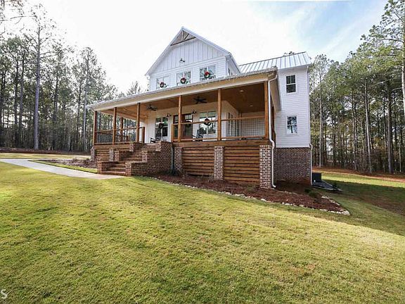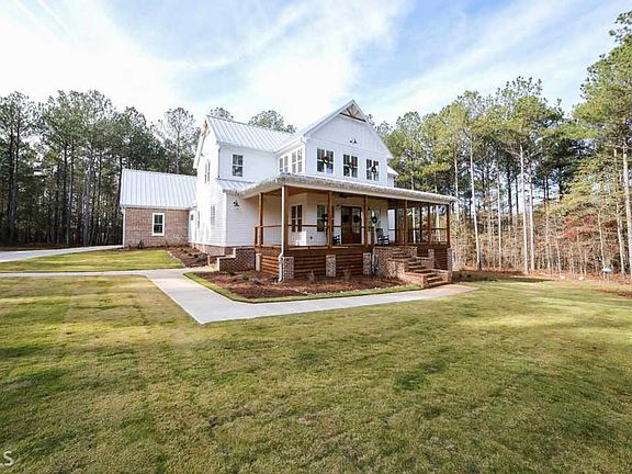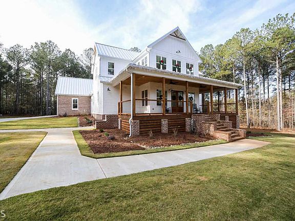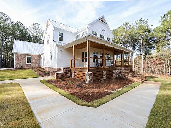This custom built Farmhouse with full unfinished basement sits on 5 wooded Acres in Riverwalk on the Apalachee is absolutely stunning! You will not be disappointed with the detail and upgrades. You are welcomed at the front with a large beautiful covered porch, solid wood double front doors and a custom large porch swing. The main level will wow you with open concept living, two story entrance, 10 foot ceilings, 8 foot solid wood doors and custom ship lap walls throughout the main level. The kitchen continues the detail with solid surface granite counter tops, cast-iron farm sink, custom soft close cabinets, large island with prep sink and seating, pot filler and a walk-in pantry. The master suite is located on the main floor and has a large bath with a custom barn door, tile floors, tile shower with seamless glass doors, double vanities with granite and a walk-in closet, as well as access to the covered porch. Off the kitchen you will find a huge laundry and mudroom with sink, cabinets and custom built-ins. As you head upstairs you will notice a custom railing made from reclaimed wood and a beautiful view to the downstairs. Upstairs there are 3 bedrooms, 1 full bath and one jack and jill bath, 9 foot ceilings, shiplap accent walls, and granite and tile in the bathrooms. No need to worry about the floors because you will find luxury vinyl plank throughout the home. You will also be impressed with the level of detail and upgrades regarding efficiency. The exterior is hardy cement siding and brick, standing seam metal roof, maintenance free windows, an oversized garage and Emerald Zoysia sod. The entire home has spray foam insulation including roof and walls top to bottom and the home is also equipped with a water filter and softener system and central vacuum system. The full daylight basement is stubbed for a bathroom, has a poured concrete wall safe room and additional electrical panel space to expand. Make your appointment to see this one of a kind custom home today!