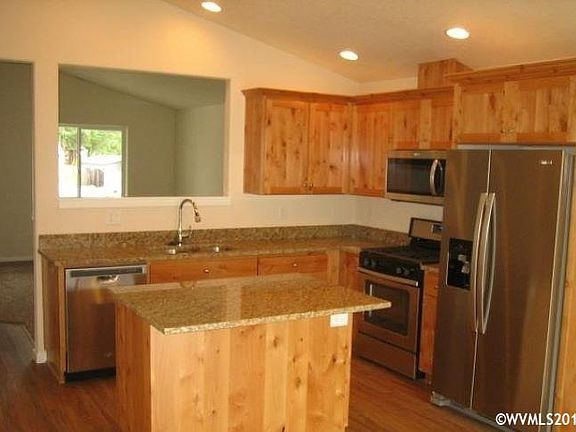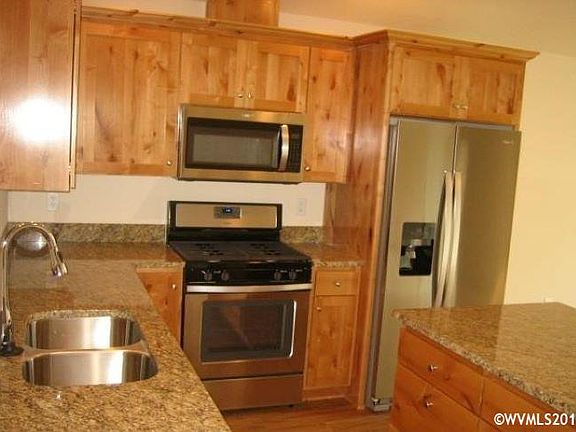 Accepted Offer with Contingencies. This one year old Dallas home features granite countertops, laminate flooring, stainless steel appliances including refrigerator with an ice-maker/water dispenser, gas range, dishwasher, and microwave and an island with bar stool seating. The dining room has a sliding glass door to the fenced yard with sprinklers. There are vaulted ceilings and forced air gas heat.
