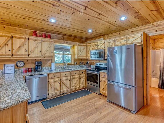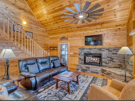 Escape to Lazy Bear Lodge, a modern cabin nestled in the heart of Blue Ridge, offering the ideal retreat! This gorgeous fully furnished log cabin features 3 bedrooms, 3 full baths, amazing loft space with scenic views, a wrap around porch large enough for everyone to enjoy! Relax and unwind in the hot tub or gather around the outdoor fire pit, surrounded by over 2 acres of peaceful forested land with breathtaking views. At the base of the property is a large, flat yard, perfect for playing with family or pets. Bordered by a trickling stream, it is truly a relaxing dream! Inside, you will enjoy the cozy knotty pine interior, open floor plan with the kitchen flowing into dining and the living room, featuring a cozy fireplace and doors onto to porch! The primary bedroom with en-suite bathroom and one guest bedroom and full bath are also located on the main level. The lower level has an additional bedroom and full bath, along with a great game room/family room. The upstairs loft makes for the perfect place to curl up with a book! The Lazy Bear Lodge is located approximately 5-8 minutes from Downtown Blue Ridge, GA in the Aska Adventure Area, which provides close access to tubing, hiking, biking, Lake Blue Ridge, and the Toccoa River. Aska Adventure Area cabin rentals are in the Toccoa River Valley, which is very close to the Rich Mountain Wilderness Area, USFS, Adventure Trail Rides for Horseback Riding, Blue Ridge Canopy Adventures for zip lining, and Springer Mountain where the Appalachian Trail and Benton McKaye Trail begins. Currently used as an active short-term rental home and a family vacation home, the dream to let vacationers pay your mortgage while you also enjoy weekends in the mountains is possible here! Fully furnished! Showings can be arranged around the current booked reservations.