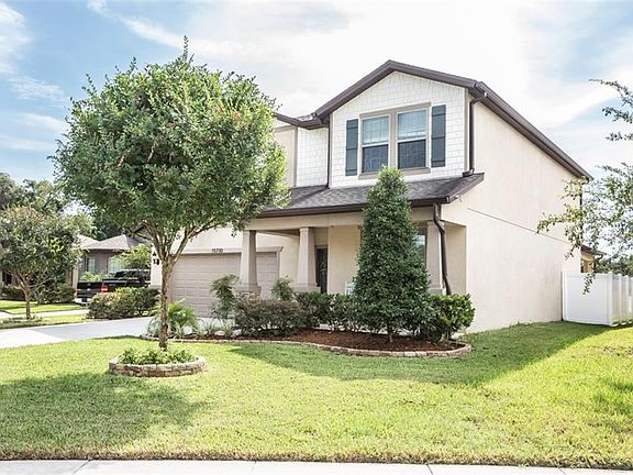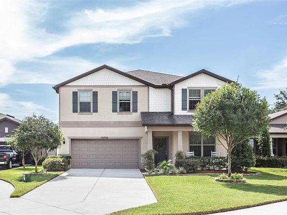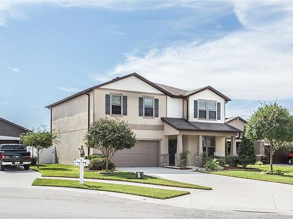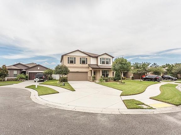 Beautiful 4/2.5/2 Two story home (over 2,600 square feet) built in 2016, move in ready located on a cut-de-sac, with no rear neighbors and a beautiful country view. Located in highly sought after Trillium, this beauty sits on an oversized lot with a large backyard and a long driveway. The open kitchen features granite counter tops and wooden cabinets with a spacious walk in pantry. The living room and dining room has brand new Lifeproof wood flooring. Upstairs this home features a huge loft, a nice sized master bedroom and the master bath has a garden soaking tub and a frameless shower. This home also features upgraded interior doors and a water softener. The back yard has a covered lanai, a swing set and a brand new 6 foot privacy fence. The community features a large pool and playground, with a low HOA/