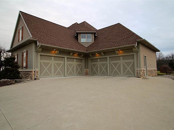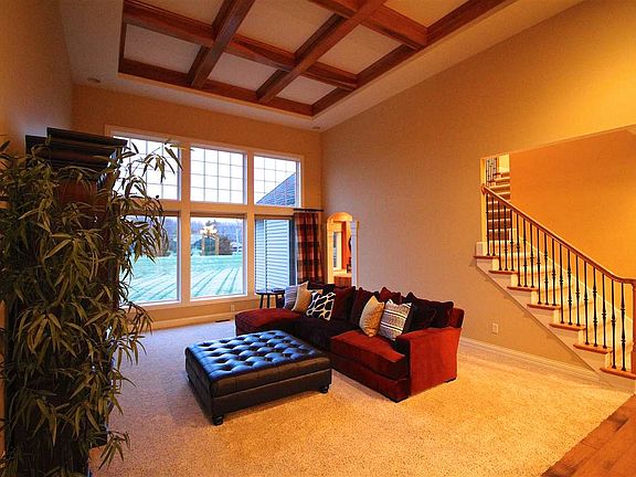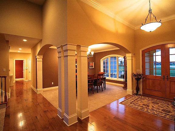 Stately 6 bedroom Twin Eagles home proudly situated on 1.6 acres! Grand foyer entry through arched French doors where you are greeted by an impressive 2 story great room w/ gorgeous coffered ceiling, an office with wonderful pond view, formal dining room with arched openings & massive pillars, wood flooring throughout first floor traffic areas, kitchen, hearth room, laundry room, mudroom & half bath. Grabill cabinets w/ granite counter tops in kitchen, 5 burner cooktop, beverage cooler, stainless steel appliances & walk in closet. You'll enjoy spending time in the hearth room with fireplace, built in bookshelves and entertainment center, also notice the window seats great for stashing toys and games. Sliding door to large deck perfect for grilling & entertaining outdoors. Speakers in many areas of the home plus outside. Laundry area has many cabinets, utility sink, closet, 3 year old Samsung washer and dryer. Large 4 car garage plus nice work area with cabinets. Mudroom area has convenient lockers and drop area. Tray ceiling master bedroom, w/ two walk in closets, 2 vanities, water closet, comfy claw foot tub & a walk in 2 head ceramic shower. Double stairway upstairs to 4 bedrooms each pair with "jack n jill" bathroom! Private playroom off of one bedroom. Incredible open plan walk out basement with plenty of room for exercise equipment, game tables, play areas, entertaining, you name it! Rough plumbed for wet bar. Watching movies, sports or your favorite programs will be an event in your own private home theatre. Large guest bathroom, craft room or 2nd office w/ storm/safe room, private guest room & tons of storage also on this level. Sliding door to patio & natural stone stairs up. Personal basket ball area. Geothermal HVAC. Pump in garage is for pulling water from pond for irrigation.
