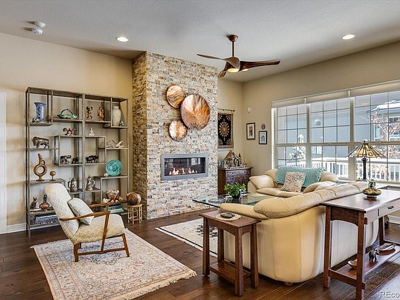This impeccable ranch home with open floor plan has contemporary finishes with neutral, yet tasteful decor making it an easy transition. Flooring is a textured chestnut hardwood, kitchen cabinets are upgraded and countertops are granite. The yard has been completely xeriscaped making it easy to lock and leave if you enjoy travel. The stunning specimens that have been chosen for the landscape are all on a regulated drip system. You will enjoy the colors of the foliage year round. Master suite is truly a retreat with ample space for all your furnishings and plenty of room for a sitting area. The home office can also serve as a formal dining room with french doors and hardwood flooring. Living room has a stacked stone gas fireplace with large windows looking toward back yard. Come enjoy this comfortable home and see why the lifestyle of Anthem Ranch is like escaping to a private club where you can live your passions every day.