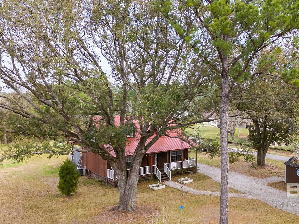 This charming 3-bedroom, 2-bathroom farmhouse/cottage is located in the tranquilBon Secour area, boasting a spacious corner lot with beautiful trees, a large frontporch, and a covered back porch perfect for entertaining and watching the sunset.The home has been updated with a new metal roof in 2021, stainless steelappliances including a new LG smart refrigerator, genuine hardwood pine floors, alarge jacuzzi tub upstairs, faux wood blinds throughout, a covered carport, andnumerous other features. The home also includes an outdoor shop / storage building.Enjoy spacious country living while still being less than 30 minutes from the beach!