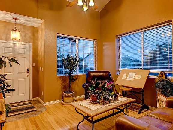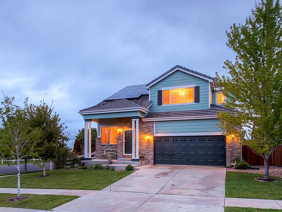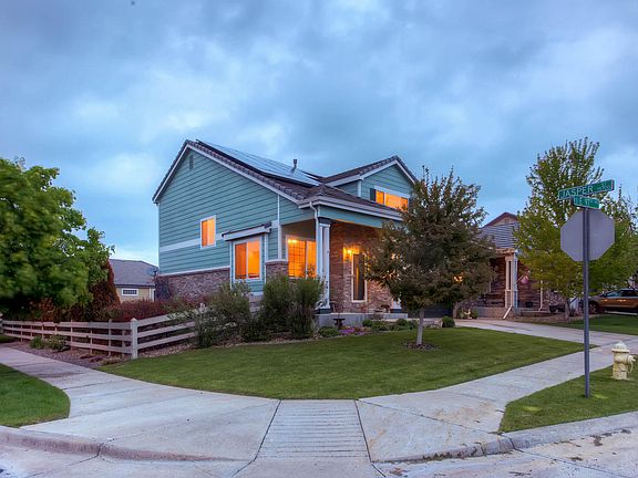 A huge corner lot in Fronterra Village awaits you where fruit trees abound and you are surrounded in your own serene outdoor oasis. This 2 story 4 bedroom, 3 bathroom home does not disappoint with a great floor plan complete with 2 sitting areas, downstairs bath, and spacious kitchen with upgraded cabinets and counter tops, plus stainless steel appliances. Do you like very, very low power bills? This home is outfitted with solar panels so you are ensured clean, Eco-friendly power at a steal of a deal and barely any monthly investment. The home is also located directly across from the community park so summertime fun is right outside your back door. The exterior of the home has been freshly painted plus the finished basement and upstairs bedroom boast brand new carpet. additionally also features hardwood floors and tile bathrooms. With quick access to E-470 and a short hop to DIA, your location for the commuter is ideal plus you have easy access to grocery shopping and area amenities.
