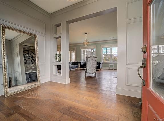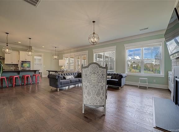 Charming craftsman style could easily have 5 bedrooms. It is a 4 bedroom/4 bath home with 5th flex room that has a full bathroom! Come home to a beautiful open floor plan with hardwood flooring throughout the main level and much of upstairs (2 bedrooms with brand new carpet!). Main level includes study & dining room, gourmet kitchen opening to great & breakfast rooms. Kitchen features granite countertops, backsplash, double ovens & MORE! Also on main level is a guest suite w/full bath. Upstairs is a spacious owners suite & luxurious tiled owner's spa bath along with secondary bedrooms & the possible 5th bedroom/âflexâ room which opens to itâs own veranda. The large additional bonus room features amazing built-in bookcases, hardwood floors and MORE! Great screened porch for entertaining or relaxing, fully fenced yard, front & back irrigation & MORE! Community has swimming pool, tennis, club house, exercise, park area, sidewalks. Fantastic location & lower Mecklenburg/Pineville taxes!