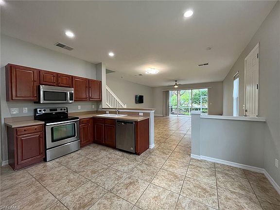 INCREDIBLE OPPORTUNITY TO OWN this limited and rarely available bright and spacious end-unit townhome, open floor concept on the main living area and featuring three bedrooms and two and a half baths. Family friendly kitchen with all open space through the living and dining area with over 1700 Square feet and a private screened lanai. The master bedroom features high vaulted ceilings, a walk in closet along with an on- suite bathroom with walk in shower and dual sinks. Attached 2 car garage and newer roof (Aug'19). Milano community has low HOA fees. Ideally located in North Naples within A+ rated school district. Milano's amenities include lighted tennis courts, community pool, basketball court and dog park. All located just minutes from I-75 and close to many shopping and dining options and 10 minutes to beaches.