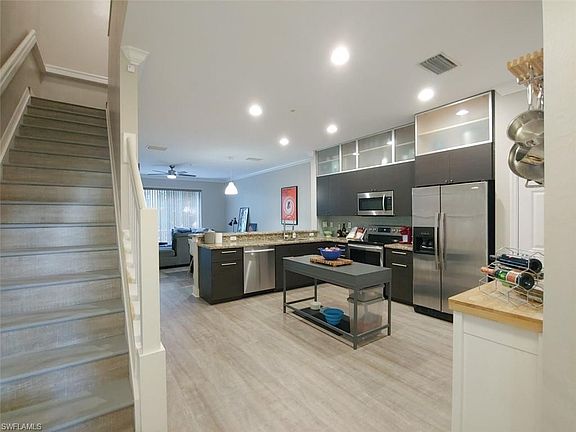 This incredibly lovely 3/2.5/1 home is a diamond! The modern kitchen features cabinetry to the ceilings with metal framed frosted glass doors in the upper cabinets. The granite countertops, stainless appliance package, and glass tile backsplash make clean-up a breeze. The waterproof wood flooring throughout the main level is warm and inviting and extends up the stairwell and onto the second floor. The home has crown molding and 5" baseboards throughout. The powder bath downstairs has a full vanity and a fun light fixture. The bedrooms are all on the 2nd level with the master being separated from the other rooms. Washer and Dryer are upstairs. You can enjoy the sunsets from your back lanai each evening. This home is immaculate and move-in-ready. Super pet friendly community features a community pool, tennis courts, basketball, and dog park. Maintenance dues include internet, cable, landscaping services & exterior insurance.