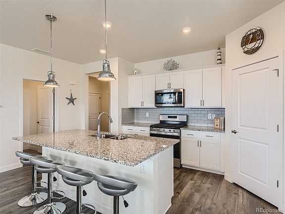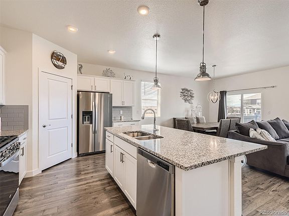 Relax in this Rare Ranch with Mountain Views. This perfectly maintained home is better than new! Open and Bright floor plan makes entertaining easy. Designer choices throughout. The kitchen features granite countertops, stainless appliances, a large island and pantry. Engineered flooring in entry, kitchen, dining room and family room. Spacious primary and secondary bedrooms. Enjoy the VIEWS from the 30’ x 10' Trex deck with wind sensor retractable awning. Smart Home with Safe Haven App. Landscaping, irrigation and sidewalks installed.