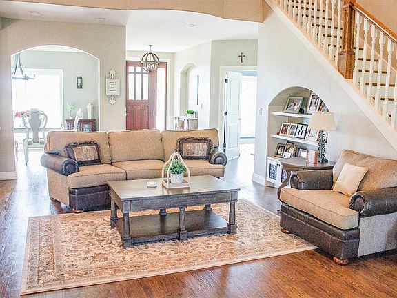 Discover this stunning 4-bedroom, 3-bathroom home blending comfort with countryside charm. Features open concept design with soaring vaulted ceilings and gorgeous floor-to-ceiling stone fireplace creating a dramatic focal point, plus spacious kitchen with modern amenities. The primary bedroom and study are conveniently positioned on the main level, while additional bedrooms upstairs provide privacy. The home office offers perfect retreat for remote work.Step outside to your personal oasis with mature trees framing stunning landscape views. Wake to breathtaking sunrises and unwind with spectacular sunsets from scenic lake views visible from your front porch. The impressive 25'x30' shop with kitchen and bath sits within a 55'x60' structure with lean-to, ideal for hobbies, storage, or workshop activities. Relax in the covered 18'x26' gazebo complete with hot tub for ultimate relaxation. This remarkable property offers perfect balance of indoor luxury and outdoor functionality.