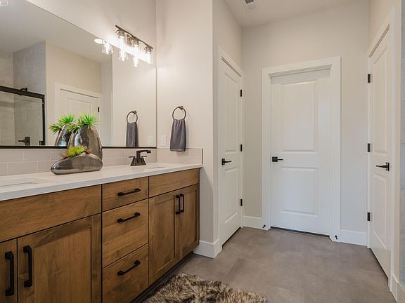The Community Giving House The Deschutes lives up to its name, offering a sense of airy space, while still being a manageable size. This single-level home is ideal for smaller families or empty nesters. This three bedroom, two bathroom, two-car garage home has 1814 square-footage and multiple exterior elevations, ranging from traditional Craftsman style to a more modern interpretations. With each, you get a welcoming covered front porch, a large, beautiful window, and elegant combinations of siding, shingles, and stonework to create a home that is beautiful, comfortable, and designed to meet your needs. From the covered front porch, you enter a defined entry, which then leads from a coffered ceiling hallway that takes you into the great room. Off this hallway on one side is a door leading to the garage for easy access, and on the other, a passage that leads to a full bathroom with linen closet, and two bedrooms that share the bathroom. The hallway also features a coat closet and access to the spacious laundry room, which includes another linen closet for additional storage and convenience. The coffered-ceiling hallway ultimately flows into the great room through an arched entrance. The great room is part of the open-plan living design that includes the spacious kitchen and dining area. This layout creates a sense of openness that allows family and guests to interact easily and mingle, while still having a sense of separate sections. The coffered ceiling over the great room...