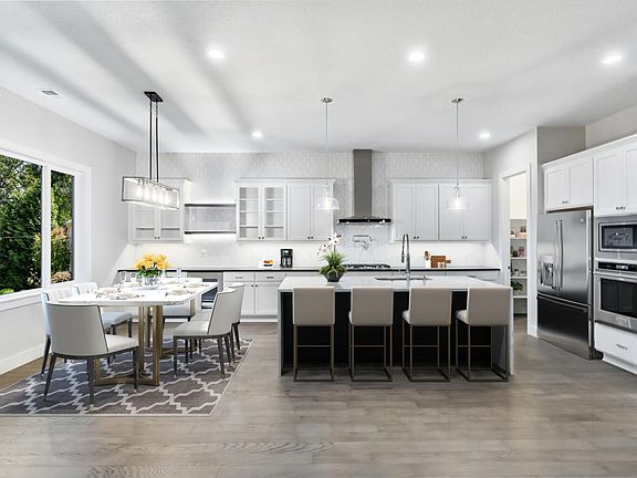 A grand entrance awaits in the Springhill home design. A soaring porch opens to an elegant two-story foyer flowing past a bright flex room to the two-story great room beyond. The well-designed kitchen overlooks a bright casual dining area and desirable covered patio, and is complemented by a large center island with breakfast bar, plenty of counter and cabinet space, and sizable walk-in pantry. The luxurious primary bedroom suite is enhanced by a stunning walk-in closet and spa-like primary bath with dual vanities, large soaking tub, luxe shower with seat, and private water closet. Central to a generous loft, secondary bedrooms feature ample closets, one with private bath, two with shared hall bath with dual-sink vanity. Additional highlights include a generous flex room, versatile first floor bedroom with walk-in closet and shared hall bath, convenient everyday entry, centrally located laundry, and additional storage.