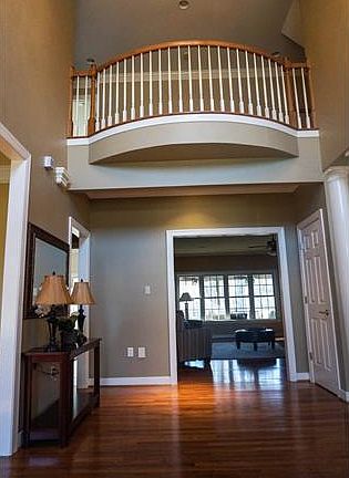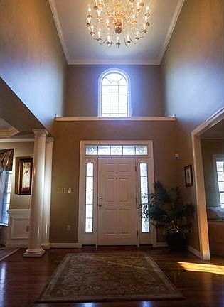 Awesome 5400 sq. ft. Brick Front open Transitional Plan features a grand entryway with 2-story foyer, gleaming hardwood floors, lots of columns, and expansive view of the open concept first floor. Enjoy elegant formal living & dining rooms, 1st Floor pvt. office w/ 2-sided fireplace, large open family room w/ built in cabinets surrounding warm gas fireplace, all opening to an impressive gourmet kitchen w/ granite tops, tile backsplash & center island workspace. Also enjoy the bright glass sun room off kitchen, 13' mud room with folding station & storage! Huge 2nd floor Master w/ sitting area & pvt. balcony overlooks wooded back yard and has 2 walk in closets, custom shelving, plus luxury bath w/ his and her vanities. 2 of the bedrooms have their own pvt. baths and 1 would make a nice 2nd master suite or teen suite w/ pvt. bath. Finished 3rd floor has private bath & additional bedroom. Makes great rec. room or home Theater! The fun continues outside with a beautiful covered porch w/ columns, deck, and patio overlooking this private wooded back yard. Foxfire offers access to the Reservoir with a canoe launch, pool, tennis, sidewalks, trails, and playground.