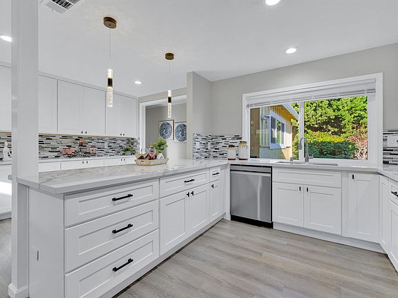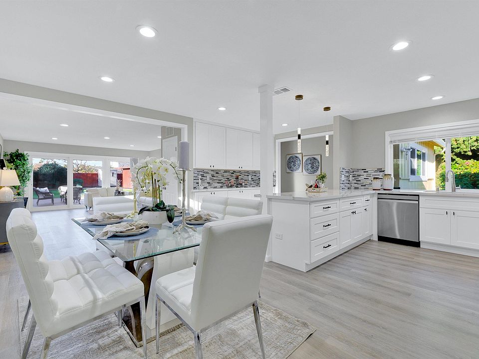 Newly remodeled ranch-style home sits on a rare 8,305 sq. ft. flat lot in sought-after San Lorenzo Village. Huge potential for adding ADU or expansion. Northeast-facing, this cozy home features a brand-new kitchen with modern white cabinetry, a buffet table, stainless steel appliances, sleek quartz countertops and backsplash, and a new sink and faucet. The spacious living room boasts 3-door-wide sliding door that filled the space with natural light, while waterproof SPC flooring enhances all common areas.The bedrooms are upgraded with engineered hardwood flooring, new ceiling lights, and new closet doors. Both bathrooms are newly updated with premium materials; the master bath includes a stylish 12x24-inch tiled shower, vanity, and sink, while the hallway bath offers new tile flooring, a modern vanity, and a spacious layout.Recessed lighting brightens every corner, and the two-car garage, along with a long driveway, provides parking for up to five vehicles. The expansive backyard is an oasis, featuring a central tile-paved patio ideal for family gatherings or barbecues, lush green lawns, evergreen trees, and two storage sheds. Conveniently located within walking distance of three public schools, this home is the perfect blend of modern updates and family-friendly living.