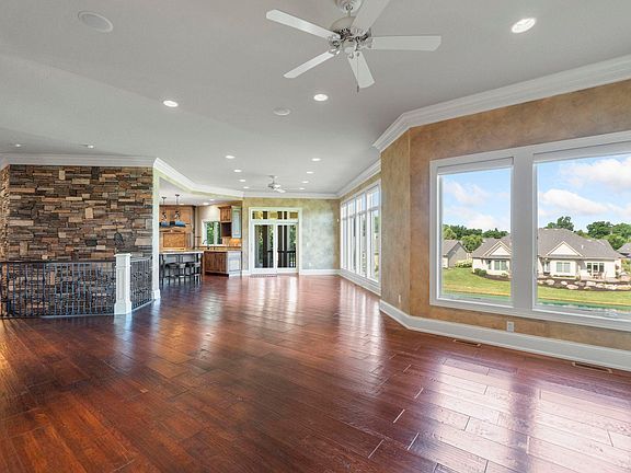 Exquisite villa in highly desirable Twin Eagles! This stunning, custom home is truly one of a kind and doesn’t come around often. With impressive attention to detail and high end finishes throughout, this 4600 square foot home is sure to “wow” you at every turn. The main level features a gorgeous kitchen with custom cabinetry and granite countertops, executive-style den with coffered ceiling, great room with custom built-in shelving and beautiful stone fireplace, large laundry room complete with sink and plenty of workspace, and two separate master en suites, one with a walk-in closet, walk-in tile showers along with a soaking tub in the primary. On the daylight lower level, you’ll find two additional bedrooms, one an additional en suite with it’s own beautiful tiled walk-in shower, kitchen with appliances and wraparound bar perfect for entertaining and large gatherings, second living area with floor to ceiling stone detail, rec room and large storage area with epoxied floors. Enjoy your morning coffee and peaceful evenings on the 15x14 second-level gazebo off the eat-in kitchen. Spectacular lot with stunning views down the scenic pond. Compare to replacement cost if you dare.
