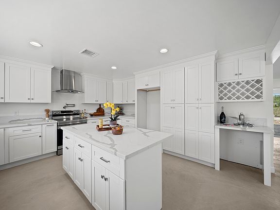 This is a beautiful single-story home located in the Crystalaire Country Club community. It has 2 bedrooms and 2 bathrooms, but it can be easily converted into a 3-bedroom home as the space already has a window and closet. The entire house has been remodeled down to the studs and is move-in ready. The open-concept floor plan is spacious and modern, with lots of natural light coming in through its wall-to-wall sliding glass doors. The kitchen is brand new and features a large island, a wine rack, space for a wine fridge, and beautiful Calacatta gold quartz countertops. All appliances are new and made by Samsung, including an electric range with Wi-Fi, air fry, and convection features, a pot filler, a top control quiet dishwasher, and plenty of counter space and storage with soft-close drawers and doors. The master suite is fantastic and includes a large bathroom and walk-in closet. The bathroom has a relaxing soaking tub, a separate walk-in shower, and a dual vanity area with LED mirrors. The master suite also has direct access to a large, serene, covered patio that overlooks the golf course. The guest bedroom and bathroom are on the opposite wing of the house, providing extra privacy. The bedroom has sliders to the patio and also overlooks the golf course. The bathroom features a large, modern walk-in shower. There is a new, spacious laundry/utility room next to the garage with cabinetry and butcher block countertops for easy ironing or clothes folding. The house also features a brand new, energy-efficient HVAC system, low-maintenance modern-industrial micro-pour cement flooring throughout, PEX piping, a newer water heater, and a newer cement shingle roof pre-wired for solar. Though no solar is installed at this time, the home is ready for it. There is also RV/boat parking available and a newly constructed golf cart ramp that takes you directly to the Golf Course Clubhouse and First Tee. This home is modern, airy, relaxing, spacious, and a must-see!