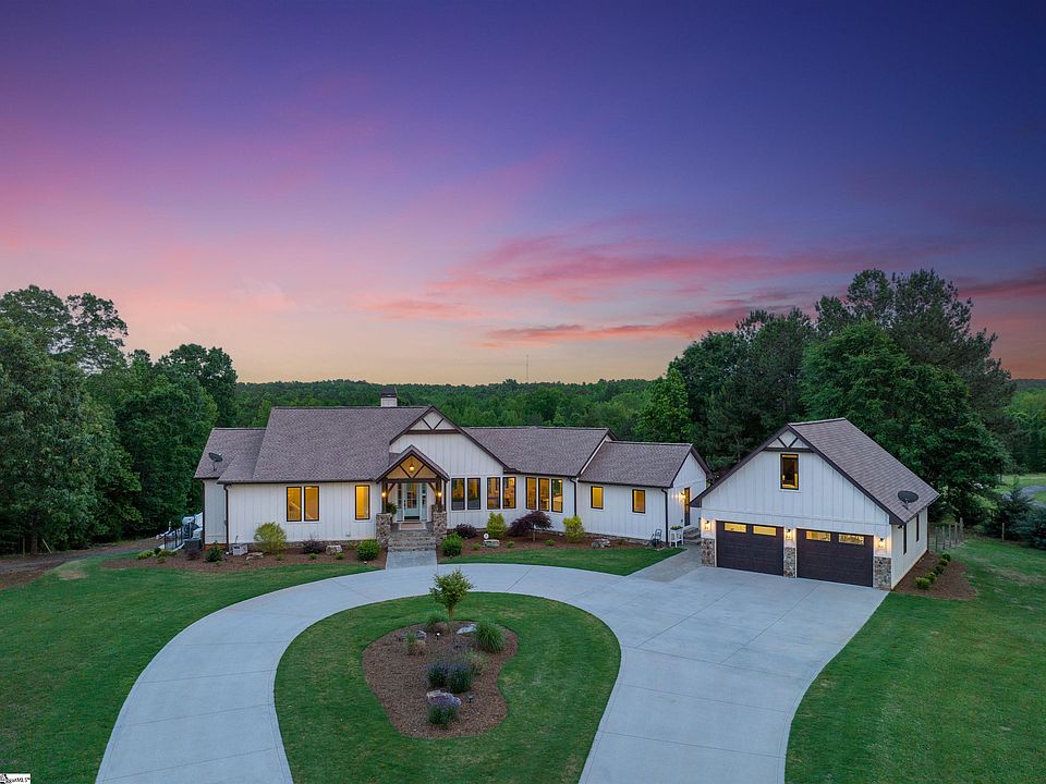 Stunning yet comfortable 2016 custom estate on 12 acres on Durbin Creek. Less than 10 min's to I-385, and 15 minutes to Five Forks. This private, gated Modern Farmhouse has all the attractions: In-ground saltwater gunite pool, waterfall spa, firepit, screened porch, covered terrace level, mini-greenhouse, chicken-coop, oversized 2 car detached garage w/full apartment, RV pads w/hookups, and so much more. 12 acres abuts Durbin Creek -- perfect for horses, a hobby farm... you're only limited by your imagination: No HOA! Interiors: 17’ white washed tongue & groove ceiling w/timber framing in great room, open quartz cook's kitchen w/view of the pasture! Master features private access to deck w/views from every window, huge tile walk-in shower, and large walk-in closet. Terrace level is a guests dream w/separate living area, space for an office, access to pool and covered patio, a custom Finnish cedar sauna and more! Your family will LOVE it and your guests won't want to leave! Pre-inspected and repairs made at sellers expense. At least 24 hour notice for showings.