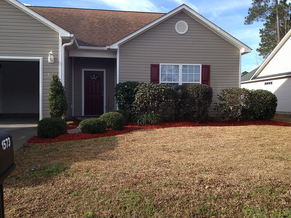Like New single family home in nice quiet neighborhood. 10 Min ride to Cherry Grove Beach. Easy access to 31 and Main Street Connector. 2 car garage. Nice size backyard with pond, screened in porch with ceiling fan, concrete pad for outside sitting area. Carpets in LR and BR's. Large MasterBR with tray ceiling and walk in closet.Master Bthroom had double vanity sinks. View of pond from breakfast nook area, LR and MasterBr. Tenant pays all utilities (water/sewer,electric which encompasses forced air heating and cooling, phone/internet,garbage pickup or can choose to bring to local facility at no charge). Tenant maintains lawn. Rent includes tv-basic cable channels or can choose to pay for additional. Rent includes access to community clubhouse: small pool,bbq area,gym equipment.