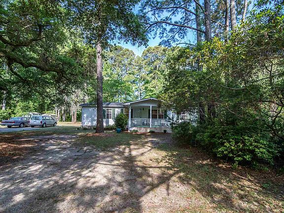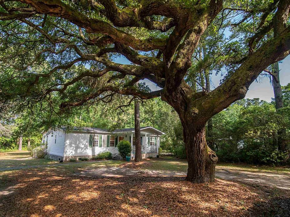 Three bedroom two bath home on one acre under a majestic live oak tree. This large shaded and wooded lot backs up to a pond. Well cared for home with newer roof and HVAC enjoys a covered front porch, screened back porch, and detached storage. Central location close to beaches, golf, and waterway.