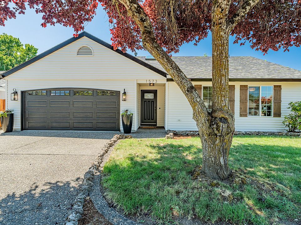 This light-filled, single-level gem delivers comfort and style — all tucked into a quiet street just a short jaunt from the local elementary school.Step under the covered front entry and into a bright, welcoming foyer where a skylight sets the tone. Soaring vaulted ceilings and fun ceiling lines throughout create a dynamic, open feel, while the cozy fireplace anchors the spacious living room. From there, it flows seamlessly into the dining area and kitchen — perfect for everyday living or casual entertaining.The kitchen was recently remodeled with all-new cabinetry, stainless steel appliances, and a skylight that keeps the space bright and inviting all day long. A sliding door leads to a flat, fully fenced backyard with a patio and open lawn — ideal for relaxing, playing, or hosting summer BBQs.One bedroom sits just off the dining area — a perfect home office or guest space — while down the hall you’ll find a full guest bath, laundry area, and three more bedrooms, including the primary suite with a walk-in closet, en suite bath, and step-in shower.Other recent upgrades include a new HVAC system installed in 2024, ensuring year-round comfort and energy efficiency.With an attached 2-car garage and refreshed finishes throughout, this home is easy to love — and just a short jaunt to school.Light, space, and simplicity — all in one place!