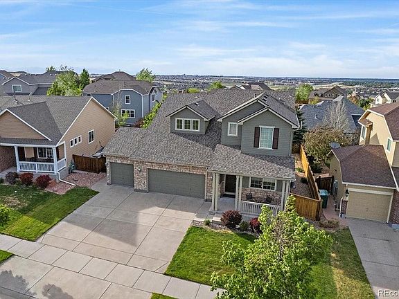 Steps away from the Horse Creek park and pool, this lovely 4 bedroom, 3.5 bathroom home awaits. A beautifully maintained home featuring mountain views, hardwood flooring, vaulted formal living and coffered ceiling dining rooms, kitchen with stainless steel appliances, eat in space and lower level family room. Upstairs, a bright and cheerful loft next to the primary suite featuring a five-piece bath, 2 additional bedrooms and 1 full bathroom are featured. A spacious rec or media room, additional bedroom and bathroom with additional storage complete the basement level. A 3 car attached garage includes extra storage in addition to the basement. The spacious professionally landscaped backyard with deck awaits for fun and play or enjoy the park and pool steps away from the front door. Convenient location on the west side of Parker for easy commutes to Denver Tech Center, DIA and downtown. Minutes away from downtown Parker with shopping, recreation, dining, and performing arts center. This lovely property is waiting for you to call it home!
