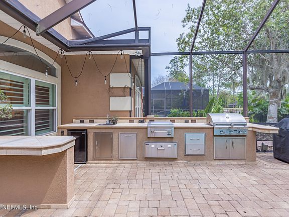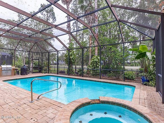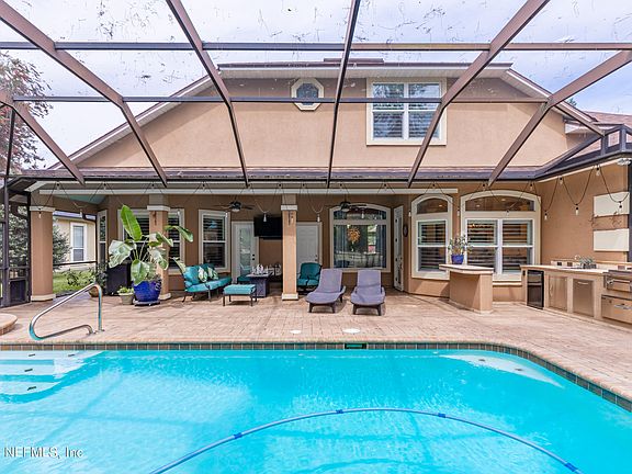 Live like you are on vacation every day in this Eagle Harbor pool home located on the 2nd fairway of the pristinely maintained golf course. The focal point of the home is the chef's dream kitchen with high-end Thermador appliances including a gas stove/double oven, built-in refrigerator, plenty of storage and stunning quartz countertops. The oversized island is perfect for entertaining and is open to the family room with views of the pool and golf course. Seamlessly integrate the indoors and outdoors on the screened lanai featuring an easy-care salt water pool plus spa with gas heater and solar panels to help heat the pool. The full summer kitchen includes a built-in gas grill, separate double burners, warming drawer, fridge and sink. A perfect spot to enjoy the Florida weather year-round in the backyard oasis. Inside, the home has been completely upgraded and no detail was spared. The well thought-out floor plan is mostly one level with split bedrooms and a bedroom and full bathroom upstairs. Other upgrades include Plantation shutters, slate tile and LVP flooring, and every bathroom has been updated. The Primary Suite will be a nice retreat from your busy day, where you can soak in the free-standing tub. The curb appeal will draw you in with extended pavered driveway, courtyard entry garage and a charming front porch. This home is ready for a new family. Enjoy all the the resort style amenities; walking distance to the clubhouse and short bike ride to the pools, tennis courts and pickleball courts. All of this in the heart of desirable Fleming Island with the convenience of restaurants, shopping and A rated schools all nearby.