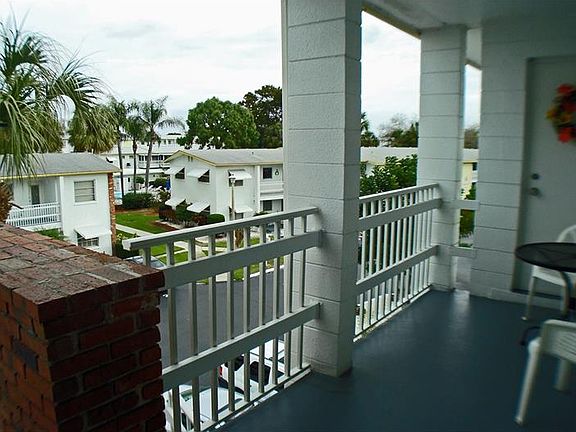 Top floor end unit - GREAT PRICE for a very pretty 2BR/1BA with both a Front Balcony & Back Lanai. Turnkey furnished. Newer appliances and Tank-less Water Heater make this appealing. Light & bright. Screened lanai in back right at tree-top level. Great as a winter residence or as year around home. Owner paid $84K several years ago, but is willing to go with current market - Outstanding Bargain for today''s smart buyer. Cost effective living with low HOA ( $213/mo) & reasonable taxes. Active 55+ community with a warm, heated pool, pretty clubhouse & patio area, recently remodeled & attractive coin laundry, shuffleboard. This association is well situated near a shopping center, bus stops, restaurants, banks. Lots of residents just walk over - it''s that close. Still in the neighborhood is a public library. Interested in the Gulf beaches - 8-10 miles west. Interested? Don''t wait...
