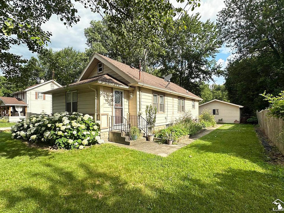 Updates include roof approx 10 years, furnace and C/A approx 8 years, cute 2 bedroom on 1/2 acre lot, fenced rear yard, 2.5+ car garage, basement, washer/dryer stays, has 90 ft deep well, city water at the street can be connected, city sewers, home located on the corner of North and Samaria Rd., driveway for home comes in on North St, enclosed front porch, living room, formal dining room, library/den listed is enclosed front porch, other updates.
