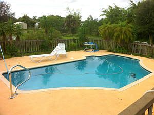 Nice, 1-story ranch home with renovated kitchen open to family room! Newer laminate floors. Split bedroom plan. Back porch was converted to a 4th bedroom and seperate living area (not permitted). Huge 16 X 16 shed with covered porch! Inground, fenced, concrete pool overlooking huge yard! You won't find a better deal in Jupiter Farms!