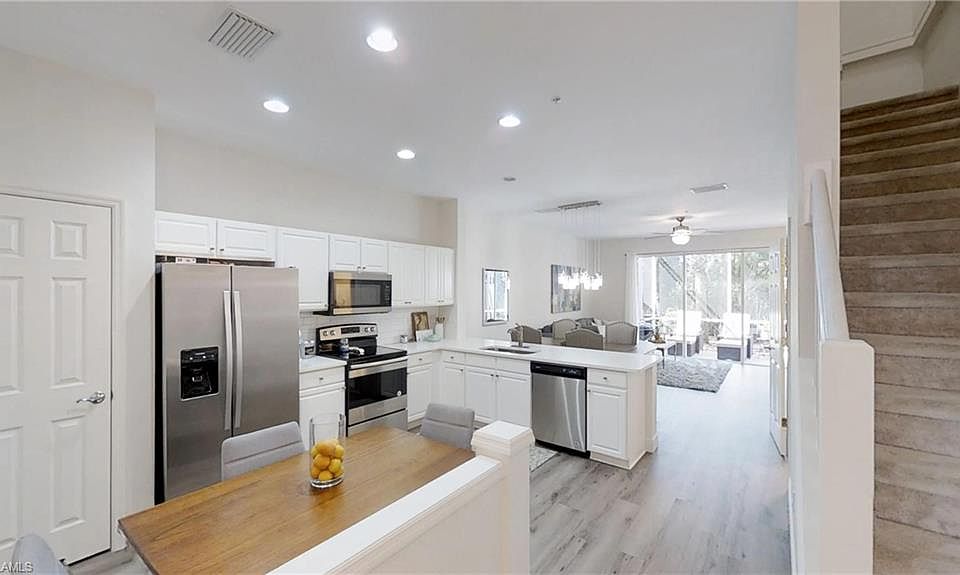 Great Location! Pristine unit featuring 3 bedrooms, 2 1/2 baths, & a one car attached garage. New flooring has been installed in the living room and kitchen. The Gourmet kitchen has been appointed with upgraded kitchen cabinets, new Carrara quartz counters, new stainless steel appliances, large new peninsula Carrara quartz counter, SS sink, tiled backsplash, faucet, pantry & dining area. The living rooms wall of sliding glass doors opens up to the private screened in lanai providing a tranquil setting with views of the landscaped area. Both bathrooms have been updated with new Carrara quartz counters, sinks and faucets. The laundry room, with its newer washer & dryer is conveniently located on the second floor close to the bath and bedrooms. Take a short drive to award winning "Vanderbilt Beach" were you could enjoy a Beautiful Naples Sunset! Close to shopping, Medical facilities, Collier County parks, schools, restaurants, theaters, & The Mercato, which hosts a vibrant year-round event calendar open to the public. Move in ready!
