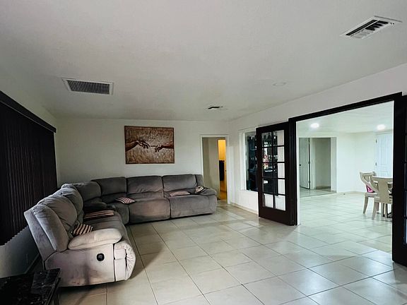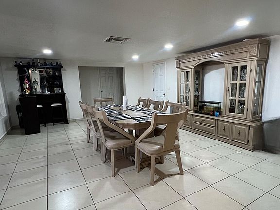 The living room is adorned with elegant French doors that open up to the dining room, creating a seamless flow and an inviting atmosphere for entertaining guests. The kitchen boasts stainless steel appliances and cherry-colored cabinets, combining modern style and functionality. Tile flooring throughout the house not only enhances its aesthetic appeal but also makes for easy cleaning and maintenance.