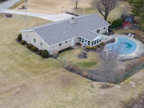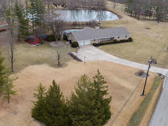 Custom built one owner brick ranch on 2.2 acres, with lake (stocked) frontage. Inground fenced pool with new liner, Geothermal heating system, Hickory cabinets, great storage, built ins, partial basement, concrete driveway with turn around, large 3 season room overlooking pool. Newer roof. Very well maintained!! 26 x 14 covered front porch. Owner states HOA is inactive, doesn't pay any dues. $243 electric budget per month per owner, pool is 2 1/2-8' deep.