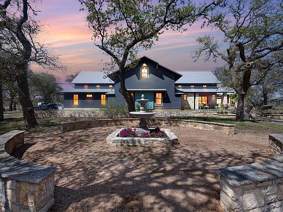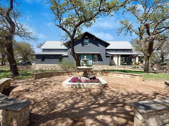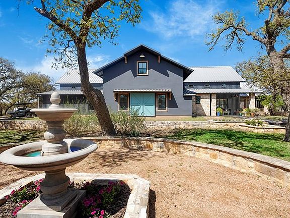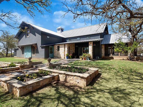 This distinguished property, encompassing over 9 acres in the Texas Hill Country offers a country lifestyle, yet is a short distance to Fredericksburg's downtown. A beautiful avenue of Sycamore trees along the driveway leads up to the striking country residence set amidst pastoral surrounds. The stout steel constructed home features an expansive open-concept layout of living, dining & kitchen areas designed for comfortable living & easy entertaining. Soaring ceilings & ample windows fill the open space with natural light, while the focal stone fireplace adds coziness to the room. The culinary kitchen, outfitted with high-end, custom finishes is equipped with gas cooking, island counter seating, and a walk-in pantry. The main level master is adjacent to a dedicated laundry room. A recent update has transformed the upstairs layout with the addition of a brand-new en-suite bathroom, creating another private suite and adding even more flexibility for family or guests. An office, accessible from the kitchen, leads to the oversized garage, storage space and climate-controlled loft. Lovely porches both front & back, along with a screened patio, provide spaces for outside enjoyment year-round. Adding to the overall appeal of this property is an absolutely stunning, fully equipped & private 2 bedroom guest house. NO RESTRICTIONS EXIST.