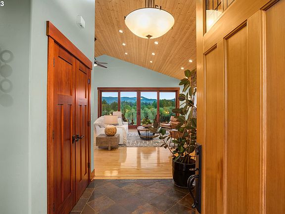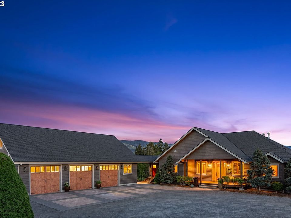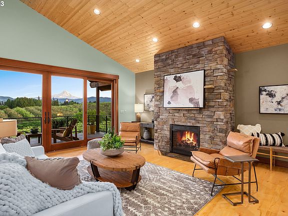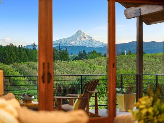 Welcome to your dream home! This spectacular Westside Hood River masterpiece is a true work of art. Custom built by Betz and Sons Construction in 2008, the estate boasts almost 4000 sqf in the main home and an additional 800 sqf in guest quarters above the garage, on a combined 13+ acres. This luxurious estate is the epitome of elegance and sophistication. As you approach, you'll immediately notice the stunning exterior, featuring a large detached three-car garage, mature landscaping, and a serene private yard. Step inside, you'll be greeted by an open and inviting floor plan, perfect for entertaining with ever changing vistas. The main floor living area encompasses a great room with a stunning stone floor-to-ceiling fireplace, creating a cozy & inviting atmosphere. The gourmet kitchen is a chef's dream, with granite counters, and ample space for cooking and entertaining. The dining area features sliding french doors leading out to the covered patio, perfect for enjoying a glass of wine and taking in the breathtaking views of Mt. Hood, East Hills, and Mt. Defiance. The main floor primary suite is a true retreat, featuring doors that lead out to the patio area. The suite is complete with a spa-like bathroom, featuring a jet tub, heated floors, walk-in shower, and dual vanities. Additionally, there is a separate office and half bath on the main floor. The daylight basement is a true masterpiece, boasting enormous amounts of light through the large windows that create the family room and wet bar area. This space is perfect for entertaining guests, with plenty of room for games, movies (theater system in place!), and more. The above-garage space boasts views of Mt Adams and could be the perfect guest suite, gym, art studio, etc. This stunning property is private and secluded, yet still in close proximity to downtown Hood River & The Heights. The orchard is active, and impeccably maintained. Don't miss your opportunity to own this Hood River estate. APPT ONLY NO DRIVEBY