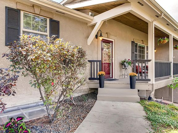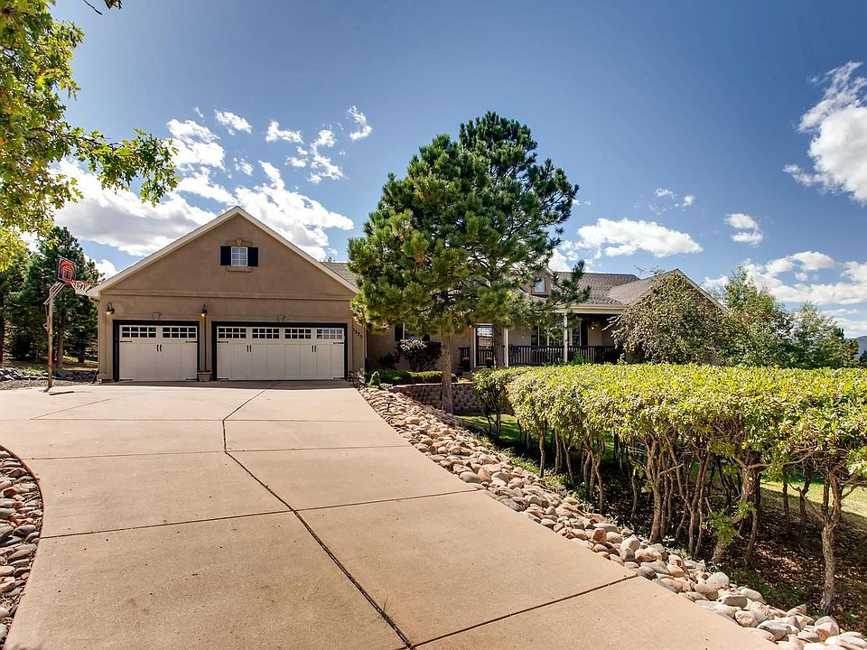 Gorgeous custom rancher on 0.75 acres with Pikes Peak and Front Range views. Welcoming covered front porch with views to enjoy the Colorado evenings. Beautiful wide plank hardwood floors throughout, entryway has a semi-custom built-in coat rack/bench/shoe storage with cubbies. The spacious great room features a gas fireplace and two huge picture windows for plenty of natural light. The office is off the front of the home and the gourmet kitchen features a slab granite center island with seating & pendant lighting, Electrolux double wall ovens, Dacor gas range top, large pantry, stainless steel appliances plus a breakfast nook that walks-out to the composite deck. Main level master retreat has and electric fireplace, walk-in closet and a custom barn door that leads into the 5pc. spa with jetted tub and custom tile work. Completing the main level is the laundry room with cabinets and sink, a powder room and a storage room.