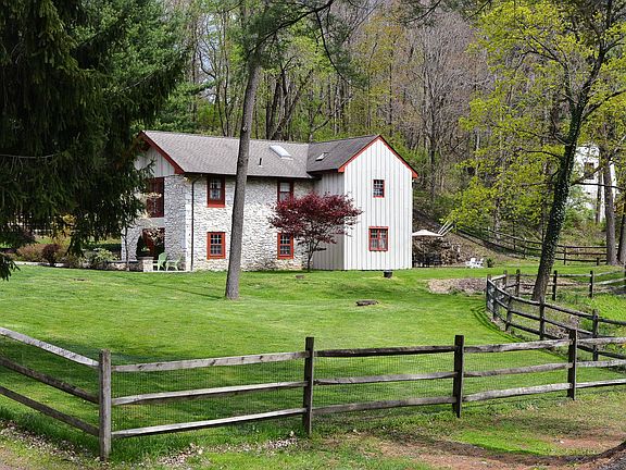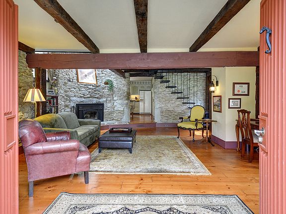 Welcome to the original 1810 Exton Wheel Right Shop & Blacksmith. This historical shop was built amongst 18th century homes and transformed into a unique, one of a kind residences. The home provides the enchanting historic feel paired with the modern conveniences of today. You enter the home through hand painted double doors that open into a striking Great room. The room has refinished hardwood floors, beamed ceilings a huge stone fireplace and floating staircase. Also on the first floor is a traditional farm kitchen with wood cabinets, Corian counters, stainless appliances and a huge walk in pantry. There is a large dining room with wide crown molding, chair rail and french doors opening to a slate back patio. There is also a first floor laundry and powder room. Ascending up the open air staircase you will find a large master suite with cathedral ceiling, dressing room, numerous closets and en suite bathroom. There are 2 large additional bedrooms and an updated bath on the second floor. Outside the home is surrounded on 3 sides by slate patios and stone walls creating a perfect environment for entertaining and enjoying the private park like setting. The home is surrounded by a beautiful and protected creek which meanders through the property and backs up to 7 protected acres of undeveloped land. Words can not do this gorgeous stone farmhouse justice. The quality and workmanship put into the restoration of this unique historic home unites both era's to give it a distinct character. Owner is proud to provide a one year home warranty!