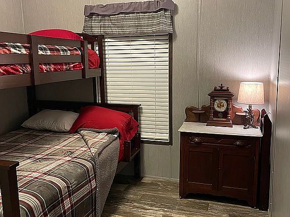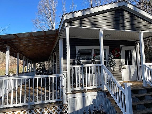 Nestled at base of the mountain, “The Lodge” home has a 60’ front porch made for rest and relaxation, wood floor look throughout the home, farmhouse style table, sink, and black appliances. Spacious living area, 2 bedrooms, 2 full baths, laundry area, and carport. Large open field with beautiful landscaping. Outdoor shed and 36’ by 18’ RV carport with electric located at road.