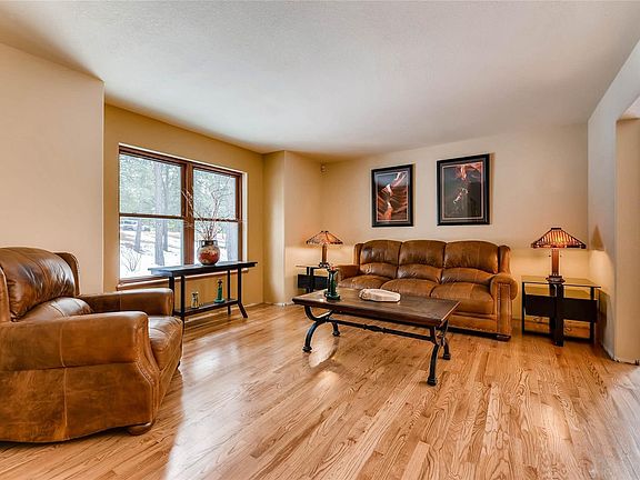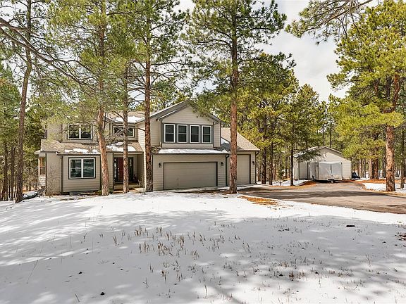 What a find deep in the trees. Fabulously located on a five acre corner lot with mature ponderosa with great access to Springs and Denver. Award winning schools, country living, with amazing amenities and immaculately cared for. This architect owned elegant two story has many upgrades including solid red oak hardwood on the main level and 2nd level, updated staircase, new carpet, finished 4 car garage & heated/finished shop that holds 2 cars. The home is wonderfully appointed & updated just waiting for the new owner. Also featuring updated laundry, upgraded light fixtures, new hardware, baseboards, bathroom fixtures, cabinetry plus tile and marble floorling. Enter onto the property on a paved driveway that leads to the home and onto the shop. Formal living and dining plus a family room, 1/2 bath, laundry, and kitchen are on the main level. The kitchen has granite counters, custom backsplash, stainless appliances and a nook area for morning dining.