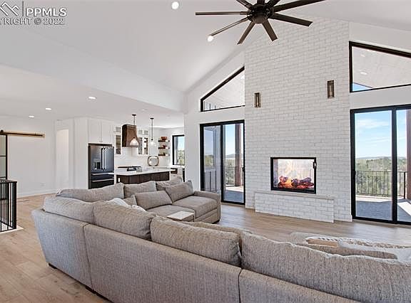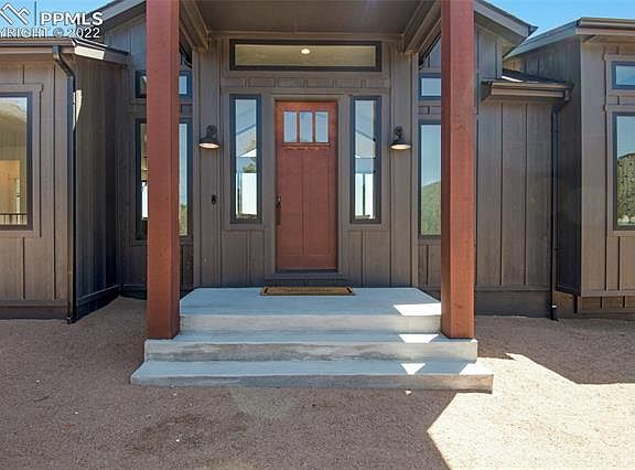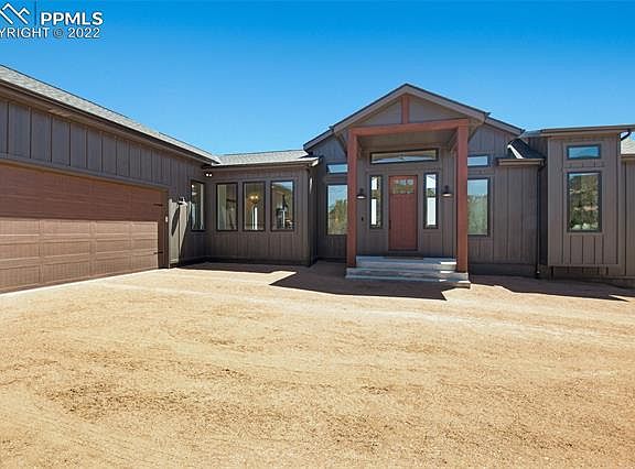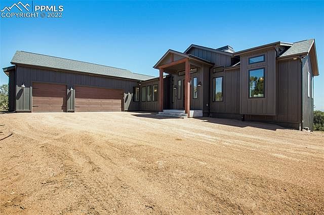 Gorgeous CUSTOM modern farmhouse on over 5 acres! Minutes from Fort Carson and Turkey Creek. No expense or detail was spared in this beautiful and inviting home. A large patio welcomes you into the brick entry and grand fireplace. The fireplace is two-sided and provides warmth to the gigantic composite deck and the great room. Vaulted ceilings with exposed beams elevate this space and add depth and character. The open kitchen has every cook's dream appliance setup! Gorgeous stone and quartz throughout. Spacious three car garage. DOG WASHING STATION-leave the dirt outside! Custom built-ins and benches/cabinetry throughout for ample storage. Modern barn doors and custom windows throughout! The primary bedroom has gorgeous features including an intricate ceiling fan and large walk-in closet. The deep soaking tub allows for maximum relaxation and self-care. Shiplap in several areas and floating wood shelving in the kitchen help to combine modern and classic features to make this home a natural beauty. The unfinished basement is open for your personal touch. Abundant natural light, high ceilings, and TWO walk-outs make for a perfect expansion opportunity. This is a dream home with terrific trails and open space. Hurry now-this gem WILL NOT LAST!