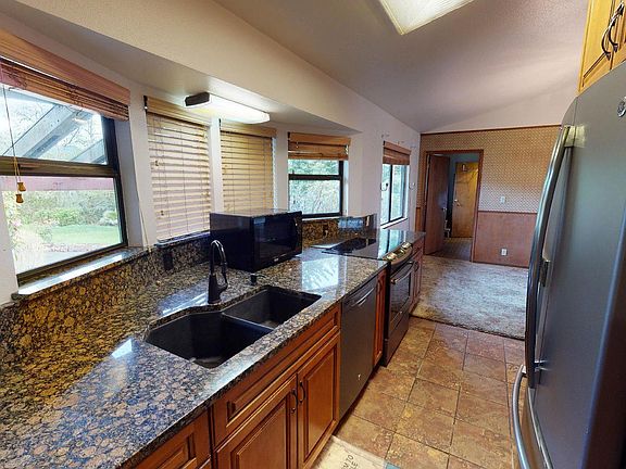 Oversized lot and a great 2BR/2BA home with additional guest quarters (1BR/1BA with kitchen and bath) on the lower level. Large living room has vaulted ceiling, gas stove and a slider to the deck. Kitchen has been updated with granite, cabinets with roll outs and tiled floor. Extra den/office with a wet bar. Big bedrooms and an oversized garage with a work bench and SO MUCH storage! Beautifully landscaped front yard and room in the back for a garden and pets. Cash buyer- fixer home.