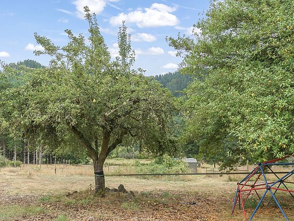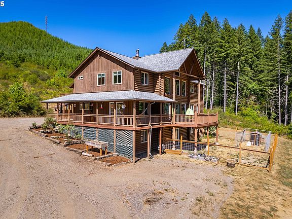 Secluded on nearly 15 acres, this 3,736 sqft lodge-style home blends rustic charm with modern convenience. The open great room features soaring ceilings, an exposed banister, and expansive windows that bring the outdoors in. A wood-burning fireplace and engineered hardwood and tile floors add warmth throughout.A highlight is the home automation system, giving you control of every light and offering three zones of high-resolution audio—a rare luxury in rural properties. Designed for multi-generational living, three of the four bedrooms include a private en-suite. The primary suite, accessed through French doors, offers a soaking tub, shower, and dual closets. Outdoor living shines with a large deck overlooking the terrain and a ¾ wraparound porch. The chef’s kitchen features stainless steel appliances, propane gas cooktop, and double ovens. The basement provides flexible space with a full bath and walkout access, while the oversized garage includes 896 sqft of additional living area, ideal for bedrooms or offices. Outside, the 42’ x 45’ barn offers concrete floors, dual roll-up doors, and two large stalls (expandable to four) with pasture access. A 12’ x 45’ lean-to adds storage, while a fenced fruit orchard and seasonal water feature enhance the property’s charm. Located just 15 minutes from Triangle Lake and 40 minutes from the ocean, this property delivers rural tranquility with modern sophistication.