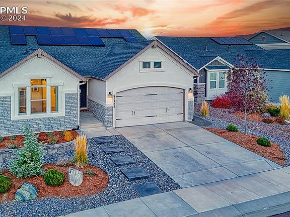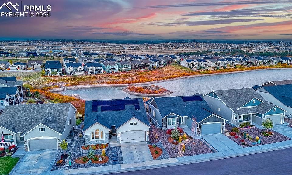 Gorgeous lake front rancher w/ walk out basement backing to open environmental land, Pinon Lake, and views of Monument Valley. No more walk out lots available in this community! Built in 2019, this like-new floor plan has fantastic curb appeal w/ custom landscaping, stucco, and stone. Open floor plan features LVP flooring throughout main, high ceilings, iron/wood stair railing, upgraded light fixtures, bright & artistic design, custom built-ins w/ hooks off garage, modern linear fireplace w/ custom mosaic tile and wood mantle, office w/ French doors, and loads of natural light. Phenomenal kitchen featuring quartz counters, wood cabinets w/ crown and modern hardware, subway tile backsplash, vent hood, gas range, walk in pantry, custom pendant light, and oversized picture window for lake views. Master suite features a 4’ extension for added size, multiple window for light & views, vaulted ceilings, & attached 5 piece spa bath modern tile flooring, gorgeous wood cabinets w/ modern gold hardware, updated light fixtures, quartz counters, huge walk in spa shower w/ rain head, and large walk in closet w/ custom wooden shelf system. Fantastic walk out basement with 9 ft ceilings, gorgeous custom wet bar w/ custom cabinets & hardware, sink, 2 beverage fridges, & floating shelves. Huge storage room w/ rough in for future junior master suite. Adorable built in kids area under stairs w/ half doors, lighting, and ball pit! Backyard is perfect for entertaining w/ large trex deck, additional stamped concrete patio, custom stone gas fire pit patio, turfed kids play area, and views of the open space and lake. Solar panels installed in 2021. Forest Lakes has 2 lakes and this home sits on one of them. Also features 450 acres of open space & trails, parks, amphitheater, etc… Truly a special location and home! Rare pride of ownership!