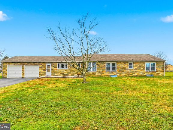 Stone ranch-style homeTwo car garageAll siding replacedSingle floor livingBacking up to farmlandRenovated en-suite bathroom